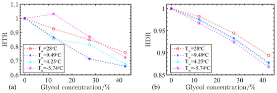 Plots of the HTRs and HDRs for different glycol concentrations. (a) Plots of HTRs. (b) Plots of HDRs.