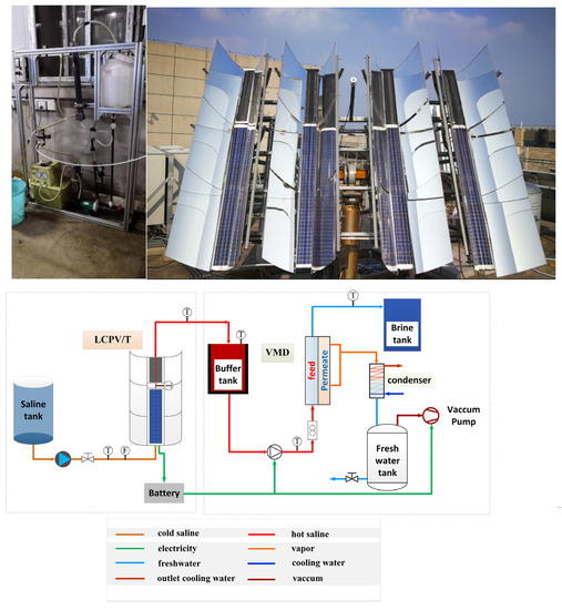 A schematic of the proposed portable LCPV/T-VMD system for desalination is depicted in Figure 1. The system consists of four PV panels arranged in series (rated power is 40 W for each), four composite parabolic condensers, saline water tank, hot water tank and important components of VMD. To simplify the processing, this schematic diagram only shows the structure of one LCPV/T unit and the solar thermal concentrator (STC) part. The detailed structural parameters and pictures of the LCPVT unit are shown in the paper published earlier by our research group [4,20]. Additionally, the system also includes a vacuum pump and two feed pumps. The MD unit is composed of a hollow fiber membrane. A large number of polytetrafluoroethylene (PTFE) hollow fiber membranes are installed in a 50 cm long tubular container made of chlorinated polyvinyl chloride (CPVC). Membrane filaments are characterized as 400 μm thickness, 48% porosity, and 0.08μm pore size. To prevent the excessive cooling water temperature from affecting PV power generation (Figure 1) the flow channel under STC without PV panels is adopted at the end of the module. Studies show that the inlet water temperature of MD should reach about 60–80 °C [21], which can have better water production performance. If the heating temperature of the concentrating module cannot meet this condition, the electric energy generated by the PV panel can be used for electric heating. Temperature data is collected by T-type thermocouples at different points in the system.