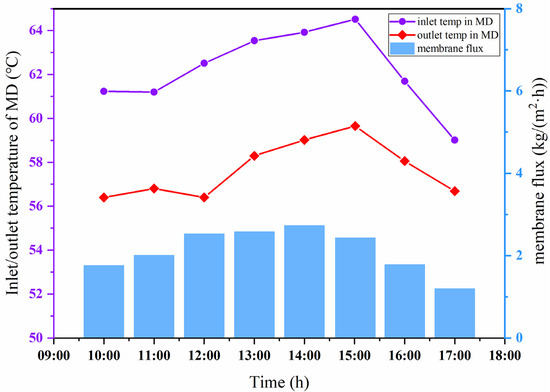 Figure 5 shows the average inlet and outlet temperature of the VMD module on the experimental day, and the corresponding MF. On the day of the experiment, the highest MF of module was 2.73 kg/(m2·h) at 14:00; the lowest MF of module was 1.20 kg/(m2·h) at 17:00. The inlet water temperature dropped sharply after 16:00, and the pressure difference driving force corresponding to the temperature difference was insufficient.
