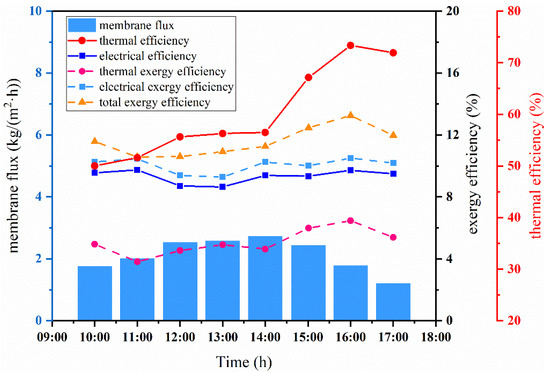 The above table shows that the average electrical performance of the system in winter (December) is higher than that in summer (August) and autumn (October), and the maximum average electrical efficiency and electrical exergy efficiency are 11.25% and 12.08%, respectively. Affected by the seasonal solar radiation and the heat absorption of the channels, the temperature of PV panels in summer and autumn is still higher than the average level in winter, which affects the electrical performance. Compared with thermal efficiency, thermal exergy efficiency more truly reflects the energy utilization efficiency of different grades. Overall, the average total exergy efficiency in summer is still the highest at 11.29%.