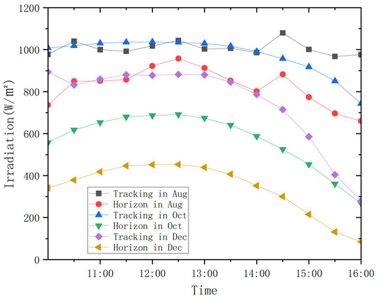 Solar radiation has seasonal characteristics. Figure 7 shows the mean data of summer (Aug), autumn (Oct) and winter (Dec) for analyzing different seasonal meteorological conditions. The average solar tracking irradiation in summer at the location is strong and stable, basically maintained at about 1000 W/m2. The tracking irradiation in winter is lower than that of other seasons; the average irradiation is around 900 W/m2 and drops rapidly in the afternoon. The effective irradiation period in summer and autumn is longer than that in winter.