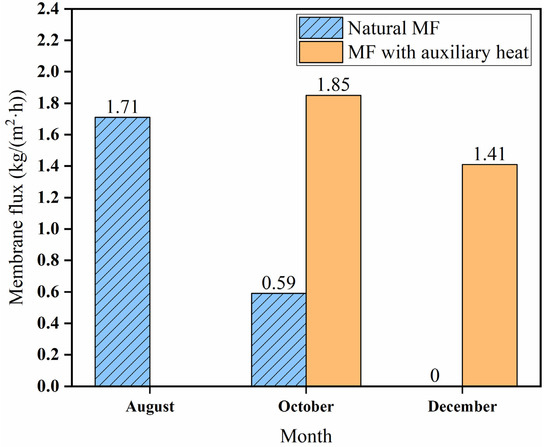 Figure 9 shows the seasonal average MF with and without auxiliary heating (natural and auxiliary). The auxiliary heating mode means the temperature control device is set to 65 °C. The monthly average natural MF is significantly affected by the season, with the highest in summer, which is 1.71 kg/(m2·h). In winter, MF is zero due to the low temperature of the feed liquid.