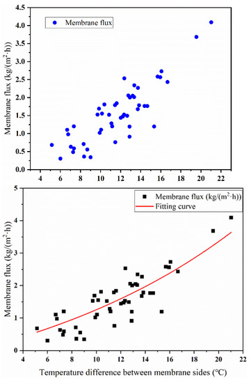 Experiments found that when other conditions remained unchanged, the MF and the water temperature difference between the two sides of the membrane showed a positive correlation. 48 groups of credible experiments are shown in Figure 10. The temperature difference of the membrane refers to the difference between the vapor–liquid surface temperature of the feed liquid side and that of the permeate side in MD. In the calculation, the feed liquid bulk temperature can be equal to the temperature of the feed vapor–liquid surface, and the saturation temperature corresponding to the permeate side pressure (at the vacuum degree of 90 kPa) can be approximated equal to the vapor–liquid surface temperature of the permeate side.