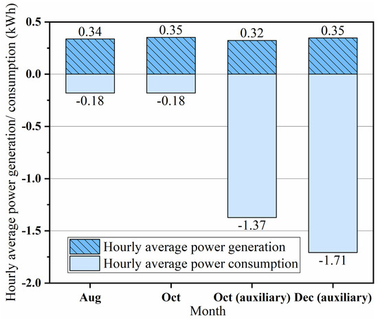 The hourly average power generation and average power consumption of the system in different months are shown in Figure 11. Negative values represent equipment that consume electricity, such as vacuum pumps, heating devices, etc.; positive values represent power generation. It can be seen that under the condition of no auxiliary heating in summer and autumn, the system can meet the self-consumption demand and realize grid-connected power generation. In the auxiliary heating mode in autumn and winter, the power consumption increases significantly, and additional power consumption is required.