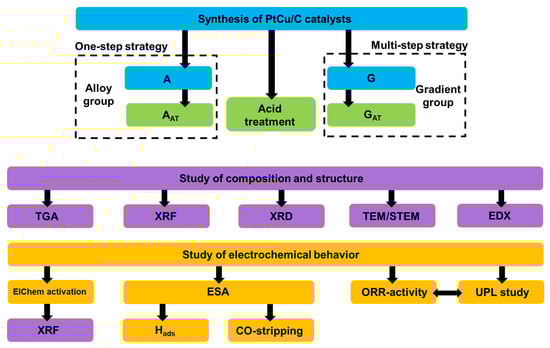 The detailed research scheme, including the preparation of the materials and the study of structural and electrochemical characteristics of the catalysts, is shown in Figure 1.