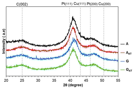 The X-ray diffraction patterns of the obtained samples demonstrate the broad reflex equal to about 25° θ typical for the Vulcan XC72 carbon support (Figure 2) and corresponding to the graphite phase (002) [11]. The platinum reflections (111) and (200) are shifted to the high-angle region 2θ compared with pure platinum (sample JM20), which indicates the alloy formation of Pt and Cu. The X-ray diffraction patterns of the AAT and GAT samples show the shift of maxima (111) to the low-angle region compared with the diffractograms of the A and G samples due to the decrease in the copper content after the acid treatment (Table 1, Figure 2). It is worth noting that the absence of the reflections typical for the copper or its oxide phase in the X-ray diffraction patterns does not mean their actual absence since the reflections can be present in the X-ray amorphous form for these materials [34]. The average crystallite size of the metal phase for the obtained samples does not exceed 3 nm. These results may be slightly undervalued due to the fact that the structural inhomogeneity of bimetallic particles can make a contribution to the broadening of maxima in the X-ray diffraction patterns [35]. Among other things, for the materials with the gradient structure of NPs, the X-ray diffraction pattern can be the result of the reflections of several phases with a different composition overlapping over one another, thus hampering a precise calculation of the average crystallite size [36]. A slight increase in the average crystallite size is observed after the acid treatment of the A and G materials [24] (Table 1).