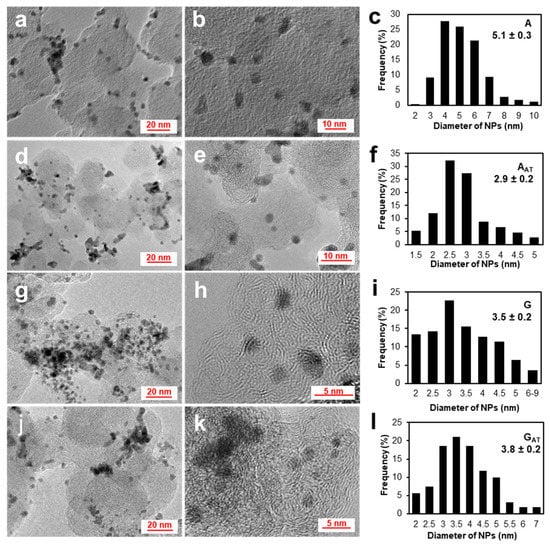 The TEM micrographs of the PtCu/C sample: A (a,b), AAT (d,e), G (g,h), GAT (j,k), and the histograms of the size distribution of NPs in the corresponding materials (c,f,i,l).