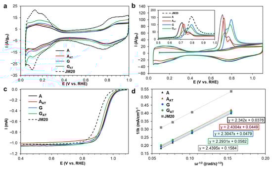 The ORR activity of the obtained catalysts was estimated at different rotation speeds of the rotating disk electrode (RDE). The linear sweep voltammograms (LSVs) of the oxygen electroreduction are presented in Figure 4c. The number of the electrons participating in the electroreduction of the oxygen molecule for all the studied samples is close to 4. According to the results of the calculation carried out with the Koutecky–Levich equation (Figure 4d) [46], at the potential of 0.90 V, the samples can be arranged in the following order with the increase in kinetic currents: JM20 << GAT < G < AAT < A. Several researchers link the activity value in the ORR of the bimetallic catalysts to thickness of the Pt shell of NPs [10,47,48].