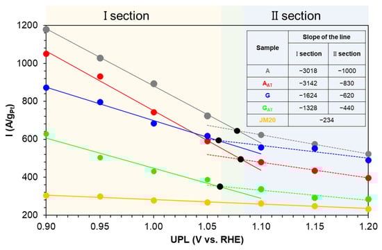 It is noteworthy that in the Imass–UPL diagram, the activity markers for the alloy group samples are located higher than those for the gradient group ones. This is due to the higher ORR activity of the catalysts based on the solid solution NPs compared with the gradient ones. Nevertheless, the different sensitivity of the activity to the values of the upper potential of the activation in two sections of the dependence is typical for both the alloy and gradient materials (Figure 6). At the same time, the gradient samples are characterized by a less sharp decrease in the activity in the first section of the dependence compared with the alloy ones, which indirectly testifies to the higher stability of the gradient catalysts.