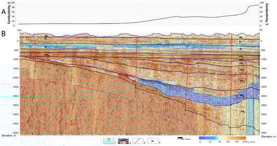 It is reasonable to run resistivity surveys before seismic reflection profiling, especially in areas with a network of roadways, as TEM data can be used to optimize the design of seismic surveys. Integrated seismic and resistivity data can better resolve large tectonic features (faults) and provide constraints for sediment thickness as a basis for good placement []. Surveys of this kind were conducted, for instance, in the Aldan-Maya Basin in 2015 [] (Figure 1), where the junction of the basin with the Aldan uplift and the limits of Neoproterozoic sediments were mapped from abrupt resistivity changes. The low-resistivity layers revealed in the basin sediments may store hydrocarbons. Low-resistivity middle Late Neoproterozoic sediments (PR2) that potentially store hydrocarbons are clearly traceable in the TEM-based conductivity pattern till a depth of 5000 m (Figure 1A).