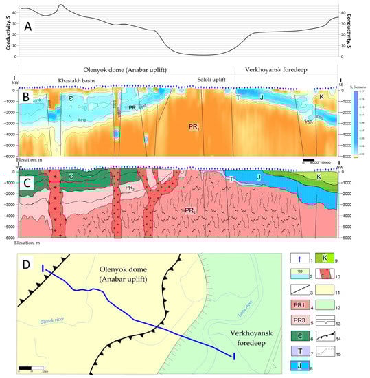 TEM soundings outcompete the multichannel reflection profiling combined with gravity survey and remote sensing [] in search of targets within fold-thrust belts and other complex geological features. Namely, TEM data from the junction of the Anabar uplift and the Verkhoyansk foredeep in the Siberian craton clearly resolve the Sololi uplift within the Olenyok dome (Figure 2), where high-resistivity Archean and Proterozoic rocks crop out []. The boundary between the resistive Proterozoic basement and conductive Mesozoic sediments, as well as exposed Proterozoic rocks and older igneous bodies, are clearly traceable in the TEM images based on conductivity data till a depth of 6000 m (Figure 2A).