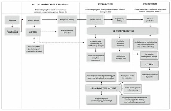 Preliminary characterization of leads and plays, with discrimination between the reservoir and non-reservoir rocks by 2D TEM surveys at the prospecting stage, saves costs at the exploration stage. 3D TEM surveys provide baseline data for time-lapse (4D) TEM measurements for subsequent monitoring of the advance of flooding []. Integrated 3D seismic and resistivity data from the same profiles provide information on porosity, permeability, and the fluid type and thus minimize the risks of drilling dry holes. TEM soundings can reveal zones of over- and under-pressure, aquifers supplying water for drilling and maintenance (sTEM), and permafrost features.