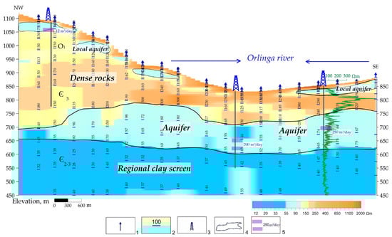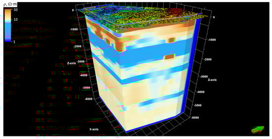 The use of sTEM for the detection of aquifers in East Siberia was successful at the Middle Botuobia oil-gas-condensate field in the Nepa-Botuobia uplift [], at the Kovykta gas-condensate field within the Angara-Lena Fault Step [,], and in other fields of the Irkutsk region and Yakutia. Water-saturated reservoirs with resistivities from 60 to 90 Ohm·m likewise stand out clearly in resistivity against the >150 Ohm·m host Cambrian clastic and carbonate sediments and <40 Ohm·m shales (Figure 4). Wet zones in East Siberia are often associated with zones of unfrozen rocks (open taliks).