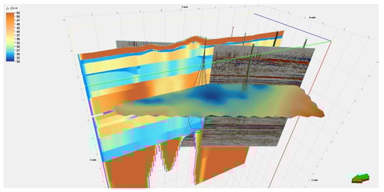 TEM soundings are highly sensitive to variations of porosity and saturation [,,] and thus have implications for the reservoir continuity and contours of reserves at new and explored fields. The best accuracy of prediction for the reservoir properties and fluid type is achievable by combined use of TEM and seismic data and their correlation to good logs and core analysis results. In some cases, lithofacies in undrilled areas can be inferred from data on adjacent drilled zones, which allows mapping the reserves as well.