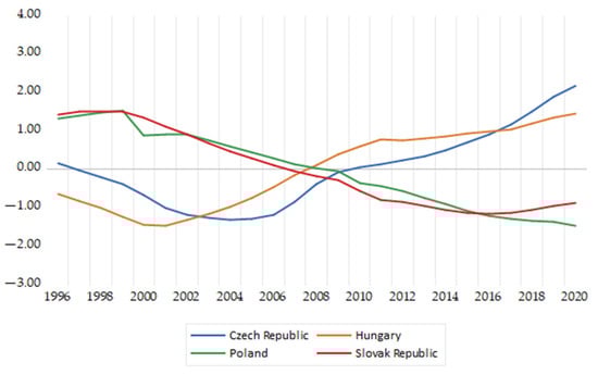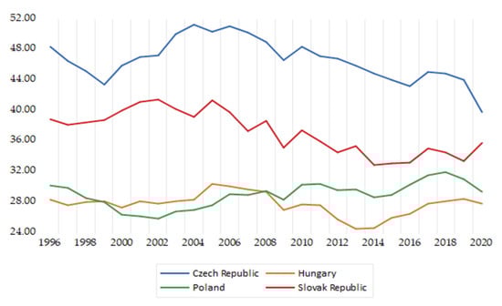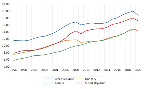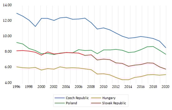 Data from 1996–2020 was used, which was dictated by the availability of comparable data (N = 25 for each country). In the case of the former countries of real socialism, there is a big problem related to the previous economic system and methods of calculating indicators, e.g., GNP. The former Czechoslovakia also split into two countries: the Czech Republic and Slovakia (1993). Many studies in these countries use data after 1995 [,].