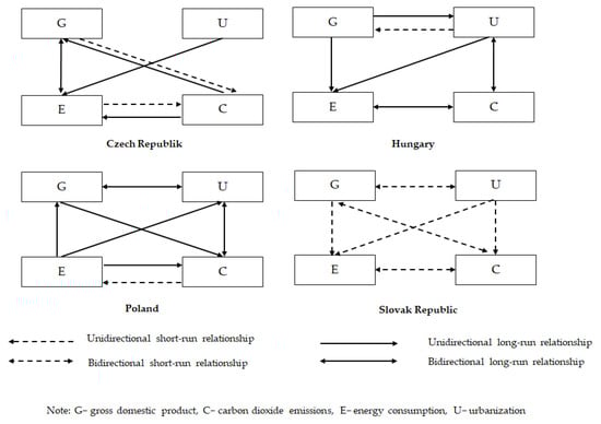 The long-term urbanization level was influenced by variables for Hungary (CO2 emissions and GDP per capita) and Poland (energy consumption, CO2 emissions, and GDP per capita). Additionally, a bidirectional relationship was confirmed for the variables GDP per capita (Poland, Czech Republic), and in Hungary for the urbanization. Unidirectional relationships in long-term were confirmed for GDP per capita and the level of CO2 emissions (Poland), urbanization and energy consumed per capita (Czech Republic, Hungary), and the energy consumption per capita and level of CO2 emissions (Czech Republic, Poland). It was not long-term causality could be determined for the GDP per capita for Slovakia and Hungary. No long-term relationships were found for the other variables for Slovakia.