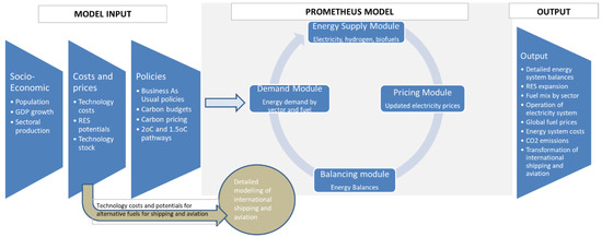 The current study aims to improve the representation of the international transport sectors in the PROMETHEUS global energy system model [23,24,25] in order to better inform decision makers of the possible decarbonization pathways and strategies of international shipping and aviation sectors. This responds to the limited focus on such sectors by IAMs, and recent broader critiques of these models [26,27]. The modelling framework [28] has been significantly enhanced with an improved representation of the international shipping and aviation sector, fully endogenizing the emission reduction options in these sectors and incorporating recent estimations for activity growth and sectoral policies and strategies. The modelling estimations of decarbonization strategies in these sectors have thus been considerably improved through integration of the costs and deployment potential of emission reduction technologies (e.g., advanced biofuels, clean synthetic fuels, hydrogen, electricity) as well as accelerated energy efficiency and operational improvement. To achieve the above objectives, sector models for international transport [20] are used to provide the required data to enhance the representation of international transport in the PROMETHEUS model, including the links with the supply side in terms of production of low-emission fuels. Using the enhanced PROMETHEUS modelling framework, the study investigates how deep decarbonization could be achieved in international shipping and aviation sectors, both in terms of technical possibilities and structural changes in the long term and the feasible actions that can be taken in the medium-term. In particular, the significantly enhanced PROMETHEUS model is used to quantify the impacts of Paris-compatible mitigation pathways for the international maritime and aviation sectors and to explore potential synergies or trade-offs between domestic climate action and international transport. The analysis also explores whether the emission goals of ICAO and IMO are compatible with the Paris temperature goals or if these sectoral goals need strengthening by 2050 and which mitigation options can be deployed.