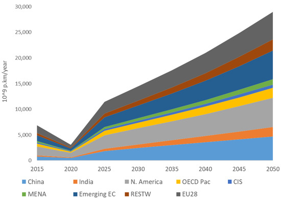 where represents the aviation services demand for time t and region r, is the income elasticity, is the price elasticity, is GDP of region r, and is the average price for aviation services. Required inputs are the assumptions on the socio-economic developments (i.e., GDP) until 2050 and the average price trends, which are endogenously determined by PROMETHEUS and are influenced by price dynamics of energy commodities and the potential imposition of carbon or energy taxes. There are numerous uncertainties regarding the exact values of elasticities. Based on a detailed literature review, different ranges can be considered based on different types and range of flights (national, international). Among all options, an average range of (1.2, 1.8) for income elasticity and a range of (−0.1, −0.25) for fuel price elasticity is chosen across regions [53,54]. Income elasticities take positive values, implying that increasing levels of GDP (or income) would result in higher aviation activity. On the other hand, negative values for fuel price elasticities mean that increasing fuel prices would lead to lower aviation activity.