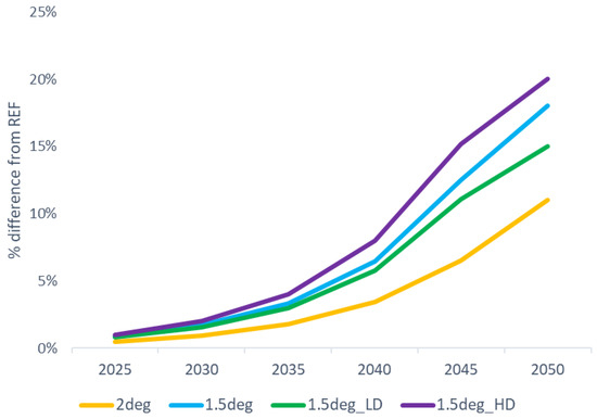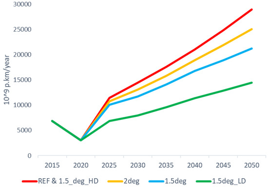 In addition, two variants of the 1.5deg scenario are developed, with modified activity assumptions, aiming to evaluate the robustness of modelling results with respect to the uncertain evolution of transport activity. The 1.5deg Low Demand scenario (1.5deg_LD) assumes lower aviation activity than 1.5deg (about 35% reduction after 2030) due to lifestyle changes towards more environmentally sustainable behaviors in line with the “Green-Push scenario” [65], where aviation activity is lower than REF and 1.5deg levels and consumer preferences shift towards domestically produced goods, thus reducing the need for global trade and shipping activity. In contrast, in the High Demand scenario (1.5deg_HD) the international shipping and aviation activity stands at REF scenario levels, i.e., higher than in 1.5deg scenario.