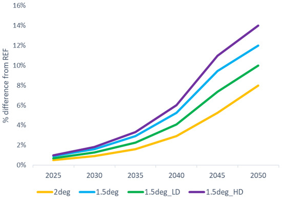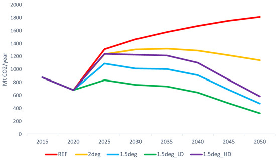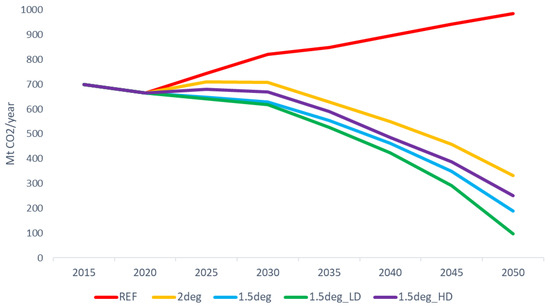 The evolution of aviation activity is endogenously determined in PROMETHEUS, based on socio-economic drivers and energy prices. Therefore, in the mitigation scenarios, where carbon pricing increases the prices of energy commodities, the aviation activity is reduced from REF levels by about 13% in 2deg and 27% in 1.5deg scenario in 2050 (Figure 4). The 1.5deg_LD scenario assumes even lower aviation activity due to lifestyle changes towards more environmentally sustainable behaviors in line with the “Green-Push scenario” [65]. In this scenario, global aviation activity stands at 32% lower levels than 1.5deg scenario in 2050 (and 50% lower than REF scenario). In contrast, aviation activity in the 1.5deg_HD scenario is the same as in REF scenario to explore the impacts of high activity levels on sector’s decarbonization.