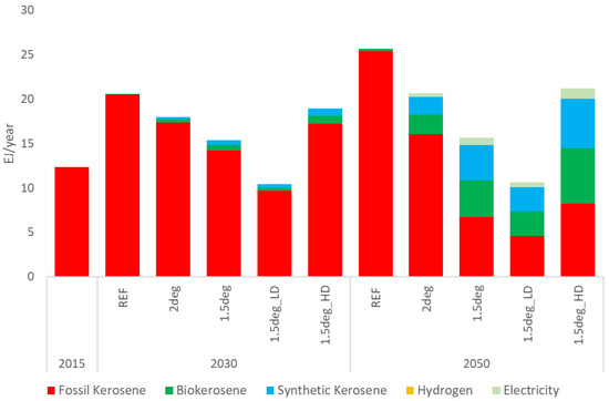 Fossil kerosene is currently the dominant fuel option in the aviation sector and is projected to remain so in REF scenario (Figure 6) with only a limited deployment of biokerosene (2% of sector’s fuel mix in 2050). The consumption of fossil kerosene for aviation is projected to more than double, from 12.2 EJ in 2015 to 25.3 EJ in 2050 driven by the strong activity growth and despite the efficiency and operational improvements incorporated in REF scenario. As most sustainable aviation fuels (SAFs) are not commercially available and currently have high costs and limited commercialization, their deployment is limited by 2030 in all scenarios examined. The analysis shows that the decade 2021–2030 does not suffice to drive significant changes in the aviation energy mix, as fossil kerosene remains the lowest-cost option, despite moderate carbon prices until 2030. The innovation, development, commercialization, and market uptake of SAFs cannot materialize in such a short period of time, given the large technical and economic uncertainties and the lack of investment and appropriate infrastructure to develop large quantities of biokerosene and synthetic kerosene. However, after 2030, the rapidly increasing carbon pricing in the 1.5deg scenarios and the development of relevant technologies and infrastructure support the massive uptake of low-emission jet fuels. Therefore, while in 2030 low-carbon fuels account for [7–9%] of sector’s energy mix, in 2050 their share increases to about 60% in the 1.5deg scenarios (Figure 6). Both biokerosene and synthetic kerosene are projected to be massively deployed in the 1.5deg scenarios to replace fossil-based kerosene, and they contribute relatively similar amounts to the decarbonization of aviation by 2050. The choice of low-emission fuels is determined endogenously by the model and depends on their production and transport costs and related implementation barriers (e.g., the sustainable supply of biomass or the potential for variable RES production by region). The uptake of SAFs has impacts beyond the aviation sector, influencing the development of the entire energy system, technology scale-up and resource use. In particular, the uptake of synthetic kerosene is based on the assumption that green hydrogen production and power-to-liquid technologies mature at sufficient rate to supply about half of the global demand for SAFs in 2050, but requiring large amounts of renewable energy stressing the solar and wind potentials in specific regions [20]. On the other hand, the deployment of biokerosene has impacts on the biomass supply system in terms of resource consumption and competition for biomass with other sectors (especially other transport modes and industries).