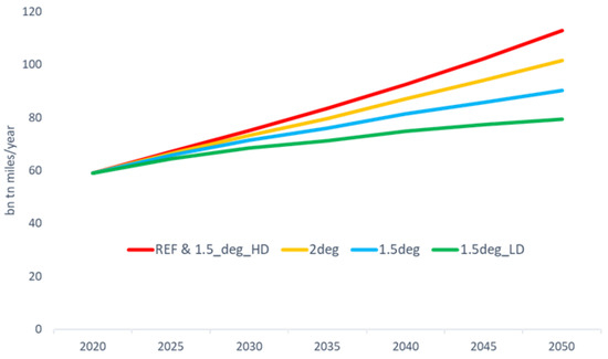 The international shipping activity is modelled to be driven by the evolution of global trade across regions for key shipping segments (containers, dry bulk, tankers) based on GEM-E3 trade projections [58,66] mapped into PROMETHEUS regions. International maritime trade has doubled in the last twenty years (from 30,000 to about 60,000 billion ton-miles in 2020) and our REF scenario projects that it will continue increasing, albeit with a decelerated growth rate, to about 110,000 ton-miles in 2050 [67]. In the 1.5deg scenarios, the shipping activity is lower than in REF, due to rising energy prices that reduce the inter-regional trade flows, and most importantly due to the reduced fossil fuel consumption and trade, which is projected to decline by more than 60% by 2050, reducing the international maritime activity by around 20% in 2050, in line with the findings of [22]. The impact of the 2deg scenario is found to be about half, causing a 10% decline in shipping activity from REF levels in 2050. The 1.5deg_LD scenario assumes even lower shipping activity than 1.5deg due to consumer preferences shifting towards domestically produced goods, thus reducing the need for inter-regional, large-distance trade. In contrast, international shipping activity in 1.5deg_HD scenario is the same as in REF to explore the impacts of different activity levels on sector’s decarbonization strategies (Figure 8).