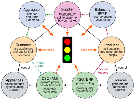 Figure 1 sketches the basic roles that can provide and make use of grid and resource state signalling. Sharing and mutually using the received information enables smart devices in the field to make smart decisions that have a positive effect beyond the individual profit. These smart entities manage assets (sources) at producer sites and appliances (loads) on customer premises. Both represent distributed energy resources (DERs) behind the meter, which constitute the prime addressees for traffic-light-like signals. Energy suppliers may offer price incentives via traffic-light-like ’saver’ signals. The local DSO may indicate the grid health, i.e., the currently available spare capacity. The inter-regional transmission system operator (TSO), more precisely in the role of the balancing responsible party (BRP), may use a traffic light to indicate the current capability to handle a supply–demand mismatch (i.e., load deviation from prediction) via the second-level reserves currently available within a balancing group. Aggregators, being on one side a supplier and at the same time a cooperative of contracted customers and producers, can accordingly send and receive signals within and beyond their customer base, respectively.
