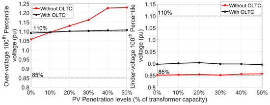 The evaluation presented in [21] focused on maintaining the grid voltages inside the statutory range defined by the upper and lower voltage limits, particularly, at 85% and 110% of the rated voltage. At different positions, both may be violated simultaneously along an LV feeder with high PV penetration and no local insertion curtailment. In that case, when only the on-load tap changer (OLTC) at the local LV transformer is used for voltage control, priority is given to mitigating the voltage that exceeds the limits most. Hence, both over-voltages and under-voltages are examined, and the OLTC is shifted in the direction that mitigates the most extreme deviation. Figure 2 presents the 100th percentiles of over- and under-voltages in a typical LV distribution feeder for different PV-penetration levels.