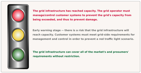 Depending on the traffic light colour, certain rules apply for the interaction of the entities that act according to the relevant market roles they play in the energy system, such as supplier, generator, storage facility operator or the statutory regulated BRP and grid operator role [33]. The green phase (market phase) persists in today’s power grid and only in rare extreme situations does it suddenly switch to red (grid phase) [33]. New is the amber state that is intended to prevent red states as much as possible. Recommendations and an outlook on expected future needs are provided in [32]. According to [26], different interpretations and recommended responses for the amber state persist.