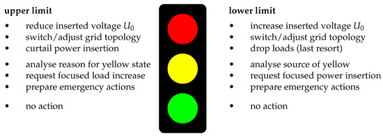 The DSO operating and maintaining a grid section is responsible for mitigating critical situations concerning the resources managed and also to assure the security and safety of electricity supply. Figure 5 shows the required and potential actions of a DSO with respect to different traffic light colours. Depending on the cause of the current issue, e.g., violation of the upper or the lower voltage limit, the DSO is expected to respond accordingly. Which actions a DSO may and can execute depends on the situation awareness and the available control capabilities. Both are commonly determined by regional regulations and policies on how DSOs are allowed or even forced to respond to supply issues and how they have to assure supply safety and security in general. A core requirement is securing the supply for critical infrastructures as long as possible.