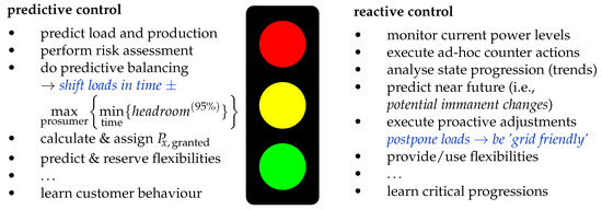In general, active customers and communities, like all customers, will utilise available resources as carelessly as they are allowed to. In case the traffic light shows green, all the entities’ EMSs can operate freely, meaning selfish, independent and focused on the entities’ profit and well-being, maximising comfort and profitability. To prevent expectable critical situations, individual EMSs may also introduce proactive control using the local entity internal knowledge on planned (scheduled) load and production cycles as wel as learned grid state behaviour patterns, i.e., typical grid state progression sequences and timing. The still selfish intention of performing individual grid state prediction is to reduce the risk and potential frequency of red-light situations with all the associated negative effects to cope with. Related tasks are listed on the left in Figure 7. On the right, we find expected responses of an EMS on behalf of the system user, e.g., an energy community or active customer.