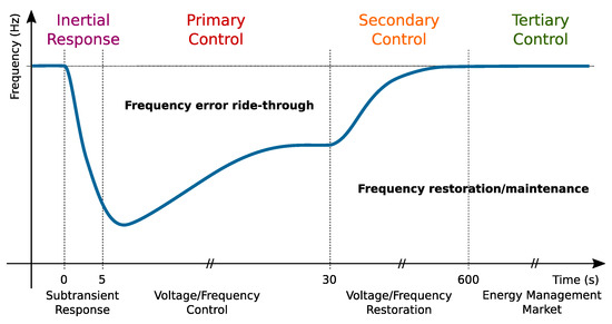 In addition to the availability of reserve power, we need to consider the timing of possible actions and responses, as sketched in Figure 8, for an exemplary sudden generation capacity loss that causes a severe frequency drop. Instantly, the inertia of synchronous rotating masses levels short term deviations. Next, within a few seconds, the automatically triggered first-order reserve capacities become active and level out any persisting imbalance via the individual responses in respect to grid codes. Depending on the current traffic light, this first-order response can be more or less heavy. Within minutes, managed by the BRP often being the regional TSO, secondary reserves take over the burden, relieving the first-order reserve capacities and restoring normal operation conditions, which typically relates to regaining yellow light.