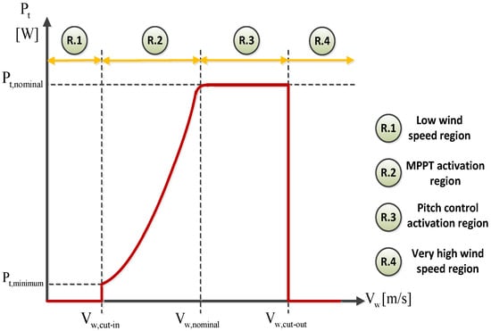 An illustration of the operating regions of the wind turbine is shown in Figure 2, which provides a detailed view of the regions at which the MPPT and pitch angle control are active. It is worth noting that in region 4, due to an excessive increase in wind speed, the system will not be able to effect pitch control, and thus the system is shut down.