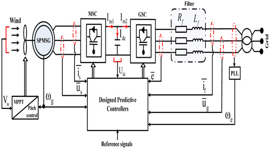 Currently, searching for alternative renewable energy sources to compensate for the depletion of usual energy sources has become a vital requirement [1,2,3]. Among the different forms of renewable energy systems, wind generation systems are considered among the most significant units [4,5]. This fact motivated us to investigate more about the most effective way to exploit and extract naturally stored energy using various control theories [6]. Concerning wind energy, the most significant part of the system to be managed is the generation unit, which is responsible for handling the electric power either to the utility grid or to isolated loads. The generation unit is an electric machine driven by a shaft coupling mechanical system rotated by the wind power [7,8]. The coupling mechanical system should be managed using a specific control scheme to prevent damage to the generator/turbine shafts. Important are blade pitch angle (β) control and the maximum power point tracking (MPPT) algorithm [9,10]. Furthermore, the suitable selection of wind turbine systems to fulfill the increasing load demands in rural area has become a vital requirement. The researchers in [11] proposed a detailed design for a horizontal axis wind turbine system according to the available wind speed statistics to ensure optimal wind power exploitation. In [12], a compromise between the capacity factor and annual power production was adopted to optimally exploit wind energy. Other researchers have been concerned with searching for suitable approaches to design a compact wind turbine nacelle to reduce maintenance costs [13].