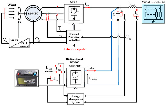 An overall schematic diagram for the standalone operation of SPMSG is illustrated in Figure 5. As can be seen, only the MSC converter is present to manage the operation of the wind driven SPMSG, while a bidirectional DC/DC converter is utilized to manage the charging and discharging processes of the battery. This is in addition to the connected variable DC load, which is used to illustrate the power handling process between the SPMSG and the battery.
