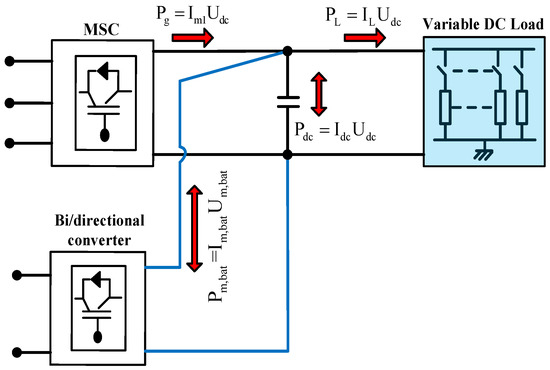 where is the load current, and are the modulated battery voltage and current, respectively, is the MSC output power, is the DC link power, is the load power, and is the bidirectional power to/from the bidirectional converter.