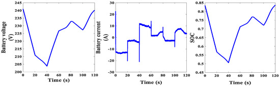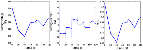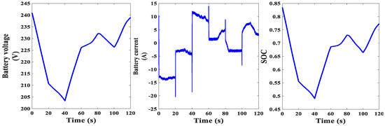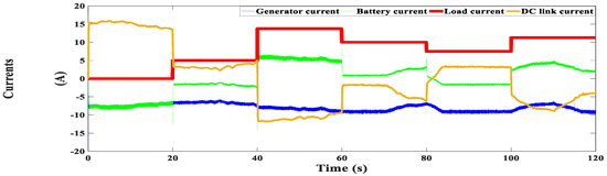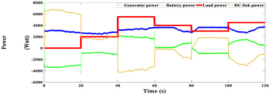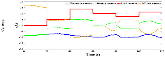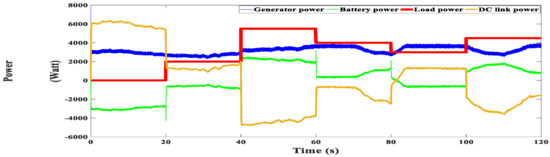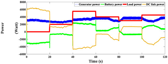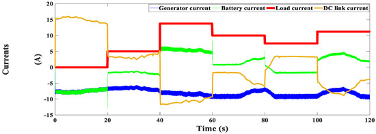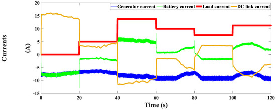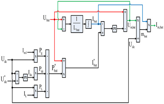 As seen in Figure 6, the bi-directional power () flow of the battery is calculated in terms of the modulated battery current and modulated battery voltage, and illustrates how these two quantities are derived by making a power balance between the different units. A detailed scheme in Figure 7 is shown. In this scheme, the procedure starts with calculating the powers , and . The collective net power of the three quantities should balance the battery power. Using the net power and battery voltage, the reference battery current is calculated, and then is compared with the calculated battery current passing through the inductor to obtain the modulated battery voltage . Finally, the modulated battery current is obtained from the battery current after multiplying it by the ratio . By ensuring power exchange balance, the load power can be effectively covered, as will be illustrated through the test results.