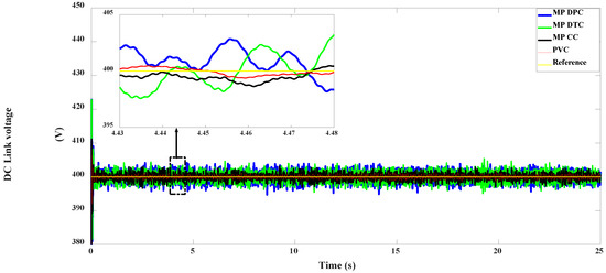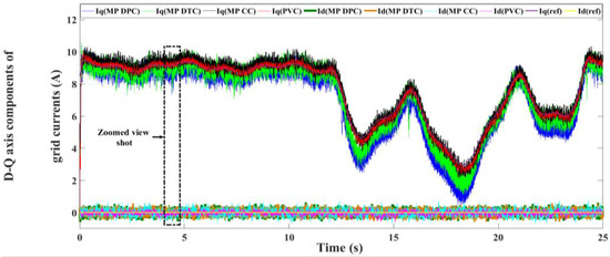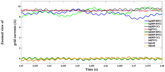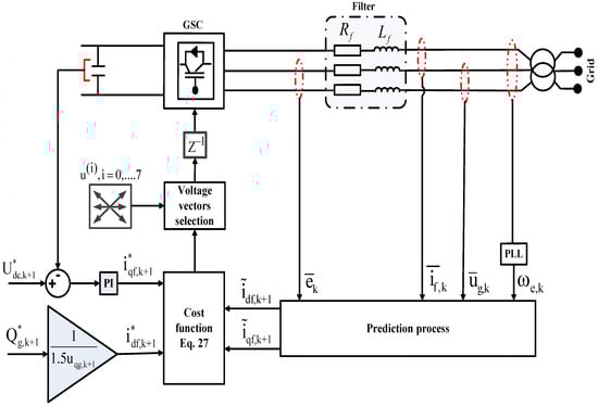 Under the orientation of grid voltage along the q-axis of the rotating frame, the reference current can be obtained by regulating the difference between the reference and actual value of the DC link voltage, while the reference current can be obtained in terms of the reference reactive power , which is set to zero to achieve unity pf operation. An illustration for the control scheme of GSC using the MP CC principle is shown in Figure 8.