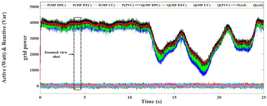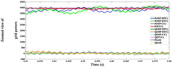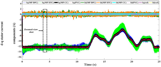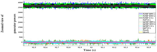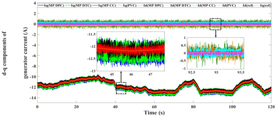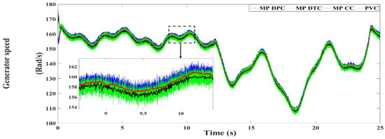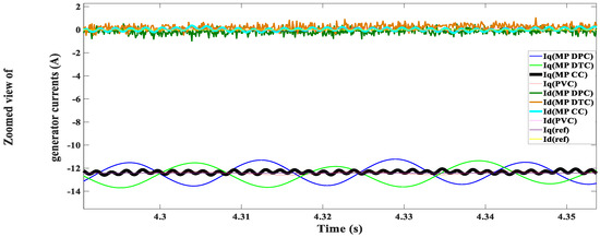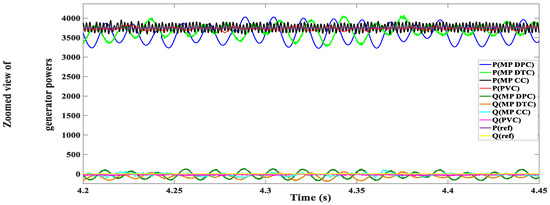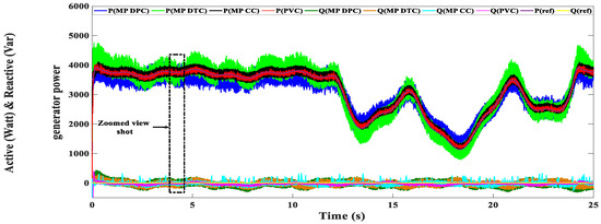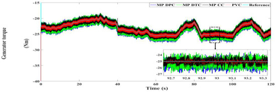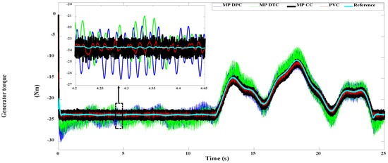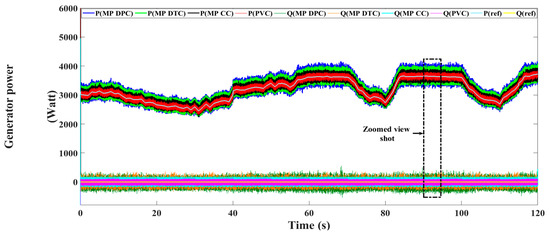 Whatever the used generator type, the implemented control algorithm for the generation unit is the most important point to be considered in achieving different requirements, such as low ripples, fast dynamics and proper steady-state operation [20]. Searching for a unique control algorithm that can achieve all or at most of these requirements is the main target of control designers. Investigations started with vector control theory and field orientation control (FOC) [21,22]. FOC achieved promising steady-state dynamics in addition to low current total harmonic distortion (THD), but suffered from high complexity and the requirement for a modulation mechanism (i.e., PWM or SVPWM), in addition to a significant response delay [23]. The direct torque control (DTC) appeared as an alternative to the FOC, with the merits of simple structure, faster response and no requirement for using a modulation stage [24,25]. The DTC achieved its targets effectively, but noticeable ripples and variable switching frequency were its most significant shortcomings. A direct power control (DPC) is a transposition, or mirror, of the DTC technique, in which two hysteresis active and reactive power controllers are used in addition to a look-up table [26,27,28]. The main difference is the used control loops; for example, in the DPC, there is no need for estimating the torque or flux using machine model parameters, as power can be directly measured using stator voltages and currents, which is an advantage of the DPC over the DTC in terms of robustness.