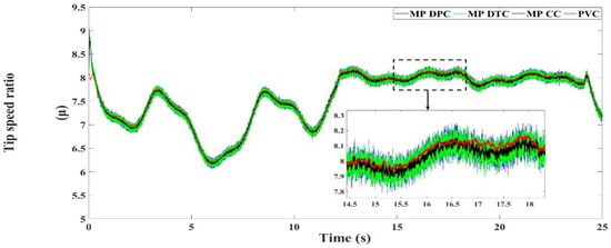 The aerodynamic model of the wind turbine is illustrated in Figure 1, which provides a detailed view of the turbine and its power management system. As shown, the system involves the MPPT and blade pitch angle control. The MPPT is concerned with extracting the maximum available power from the wind for operating speeds lower than nominal. This can be achieved by assigning the optimal tip speed ratio [10,20]. Meanwhile, the pitch angle control is concerned with limiting power in case the wind speed exceeds its rated value. This is achieved by observing the wind speed and assigning a relevant pitch angle for each speed value utilizing the Vw–β curve data and pitch servo system. The ratio μ can be evaluated by