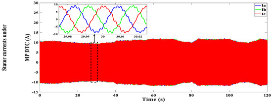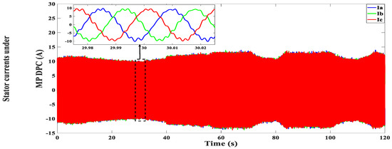 Furthermore, the three predictive controllers: MP DPC, MP DTC and MP CC are based on using one voltage vector per sampling interval [42], and this is not a precise action as absolute error deviation within the sampling interval may occur, resulting in increased ripples. Some attempts have been made use more than one voltage vector in the same interval [43,44]. In [45,46], one active and zero voltage vectors were utilized within the one interval: An improved performance was achieved especially at low operating frequencies, but the variable switching frequency and torque ripples were still present. Multi-vector MPC techniques are considered in [47,48], in which several vectors are applied within one switching interval, resulting in reduced current/torque ripples. However, the main drawback of multi-vector MPCs is that the duration time of one or two of the selected vectors result in negative values, causing the removal of such vectors. In [49,50], an MPC scheme which considered four vectors per one interval was presented to achieve lower ripples and fix switching frequency, in addition to solving the issue of negative duration times. However, the computation burdens remain the most challenging task in these schemes. The deadbeat principle has also been incorporated with the MPC as proposed by [51,52] in an attempt to limit the ripples at different operating frequencies; however, the controller was highly sensitive to parameter mismatch, as the deadbeat principle usually utilized the machine model. To avoid the issue of parameter sensitivity, [53] considered a model-free predictive control principle which utilized sampled current differences. However, this technique mainly depended on the precision of signal measurement, which is not guaranteed.