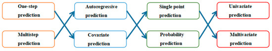Time-series forecasting is classified differently depending on the perspective. Time-series forecasting can be divided into traditional statistics and machine learning (also divided into non-deep and deep learning) from the point of view of implementation principles. As shown in Figure 2, single and multistep forecasts are simply the difference between forecasting one time unit and multiple time units in the future. Time-series forecasting can be divided into (1) autoregressive forecasting and forecasting using covariates from the perspective of input variables depending on whether or not the dimension contains covariates, (2) point and probabilistic predictions from the perspective of output results, and (3) univariate, multivariate, and multiple time series predictions from the perspective of the number of targets. These classifications are under different perspectives, and the same algorithm is often only used based on one of the classifications; for example, traditional statistical algorithms are only feasible for autoregressive prediction but unsuitable for covariate prediction [17].