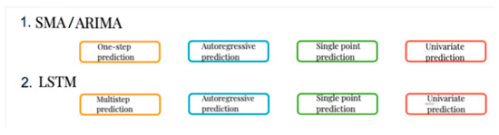 As shown in Figure 3, three typical algorithms can be used for timing prediction, of which the LSTM algorithm is the most widely used and best applied. Simple moving average (SMA) is an easy-to-implement algorithm in statistics that is very effective in reflecting trends in data over time while ignoring cyclical changes in data. The ARIMA algorithm is obtained from the moving average (MA) and adding the autoregressive (AR) operator. With the complement of the moving average, it reflects the cyclical pattern of data and predicts the time series in a one-dimensional and time-strong correlation scenario successfully from a statistical point of view.