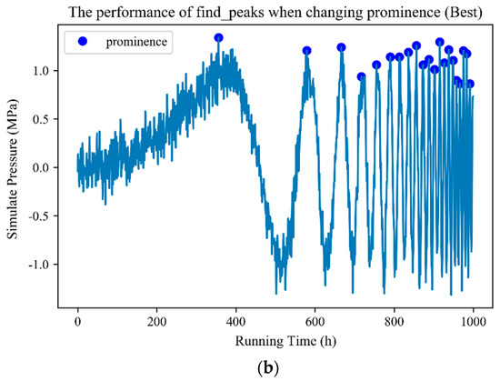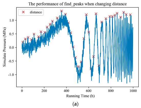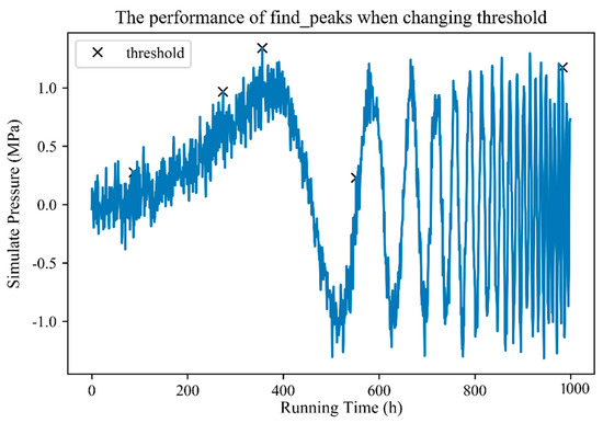 Detecting the fluctuation of the pressure parameter is crucial when predicting the fatigue life of a material. Fatigue damage fraction per unit time, total accumulated fatigue damage, and the fatigue remaining life of different materials of various parts of the system can be calculated on the basis of the fluctuation value of the pressure parameter and joint Equations (2)–(4). Actual scenes typically contain many noise points in data, and the selection of the peak position may be biased. Fully understanding parameters, such as width, threshold, distance, and especially prominence, is important to obtain a satisfactory extraction peak because noise may change the position of the local maximum.