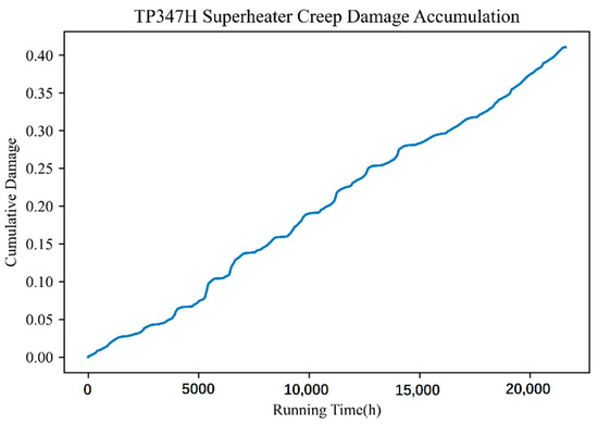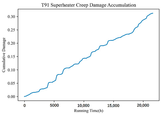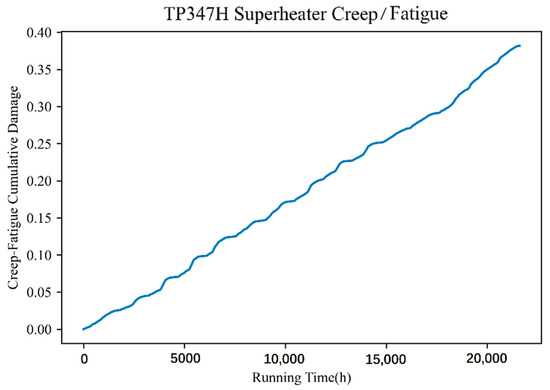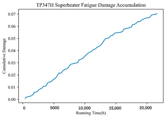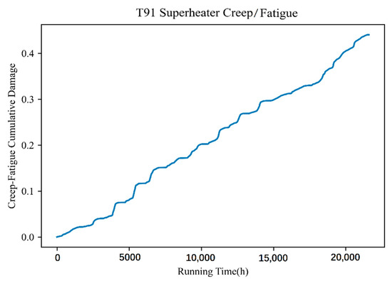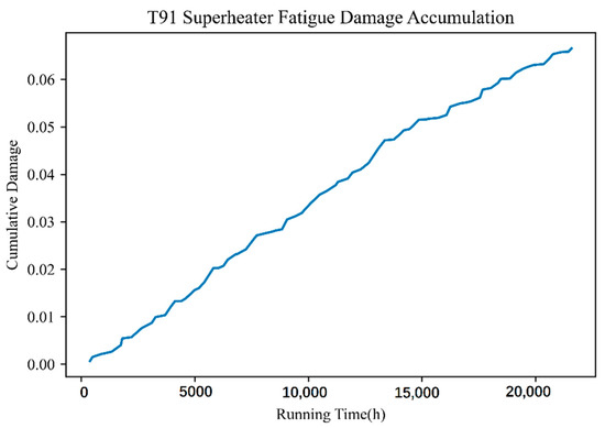 Supercritical power plant boilers will produce fatigue damage to the material when frequent deep peaking steam pressure fluctuations occur in the heated surface tube and the operating parameters change (main parameters include flue gas temperature, flue gas flow rate, steam pressure, and steam temperature), influencing the rate of fatigue damage to the material, fatigue cycle, and frequency accordingly. The respective fatigue damage and remaining life of pressurized parts of the heating surface in a fixed cycle can be calculated using real-time DCS operational data collected from the power plant boiler combined with the material fatigue life assessment model, as shown in Figure 8 and Figure 9. The sensitivity of fatigue characteristics of T91 and TP347H materials was less than that of creep damage although a relationship existed with the microstructure structure. Thus, the similar fatigue damage accumulation characteristics of the two materials further indicated that the fluctuation of environmental parameters exerts additional influence on the fatigue damage of materials.