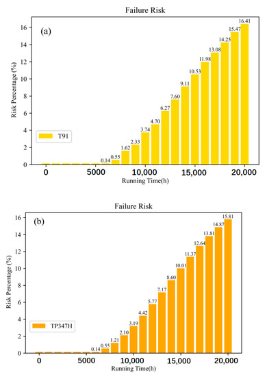 Figure 13a,b illustrates the use of the Weibull distribution model to achieve a more realistic small sample of inspection data to analyze the risk of the whole system, which was the same for both materials; at the same time, the engineer applied them in the right place according to the differences in service conditions when designing the selection of materials for the heated surfaces (where the main considerations are temperature, pressure, stress). This is why the overall trend of cumulative damage over time was essentially the same for the same damage for the different materials in Figure 6, Figure 7, Figure 8, Figure 9, Figure 10 and Figure 11, and the analysis of the available base data showed that the risks for T91 and TP347H were also essentially similar.