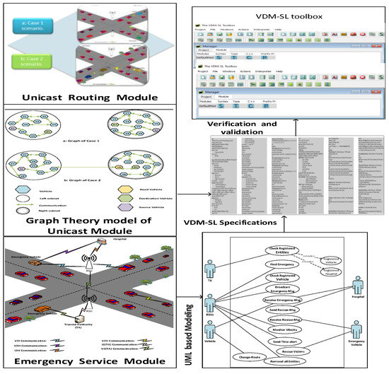 An abstract representation of the system is described in Figure 1. It displays different techniques such as VANETs, IoT, UML diagrams, graph-based models and formal methods that we have used in our system. It shows the emergency services by the arrival of an emergency vehicle at accident locations. Moreover, our fog-based strategy encompasses objects such as emergency vehicles, hospitals, RSUs, automobiles, and others who are directly or indirectly related to fog-enabled RSUs in order to give improved comfort, safety, and smooth driving. Our fog-based RSU provides emergency services like mobile RSU. It will be covered most road sections as much as possible in cities and on highways between cities. IoT will be adopted in which sensors will be used to monitor the real-time environment, and actors will be used to take action in case of any emergency. This work is displayed in Figure 1 by utilizing the emergency service module diagram as well as the UML diagram. It also represents the unicast scenarios for simple V2V communication, there are several options for a destination spot, but two of them are utilized in our system. Further, this work represents a unicast routing module diagram and graph-based model, which describe the behavior of the module. After this, these models easily translated into a formal model using VDM-SL. The VDM-SL toolbox will be used to convert the formal model into a validated model.