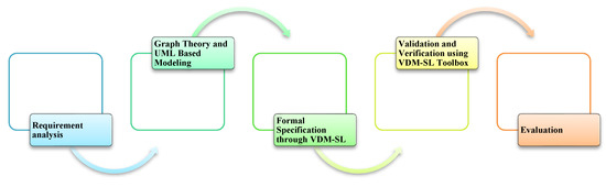 Many design decisions made in nature are related to system architectures; these decisions are generally commercial and nontechnical. We are building an efficient IoT-based formal model for vehicle-life integration allowing fog-based roadside units (RSUs) with the use of several techniques such as VANETs, graph theory, UML, as well as VDM-SL formal methods in this study. Figure 2 depicts a flow of the proposed techniques: After analyzing the system’s requirements, IoT will be adopted in which sensors will be used to monitor the real-time environment, and actors will be used to take action in case of violation. Then UML diagrams will be used to describe the informal behavior of the model. Because of its use as a data format and computing capability, graph theory is frequently used. VDM-SL may also be used to turn a graph-based model into formal specifications. The formal model will be converted into a verified model using the VDM-SL toolbox. Two separate modules are incorporated in our suggested model: a unicast routing module for V2V communication and an emergency service module.