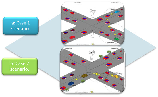 Figure 3 shows the above-mentioned scenarios. In case 1 scenario ‘a’, relay node establishes wireless connections between the source and destination nodes by carrying packets from the source and passing them on to the destination. Since the destination node’s location is identified, only certain nodes with the same lane flags as the destination vehicle are involved.