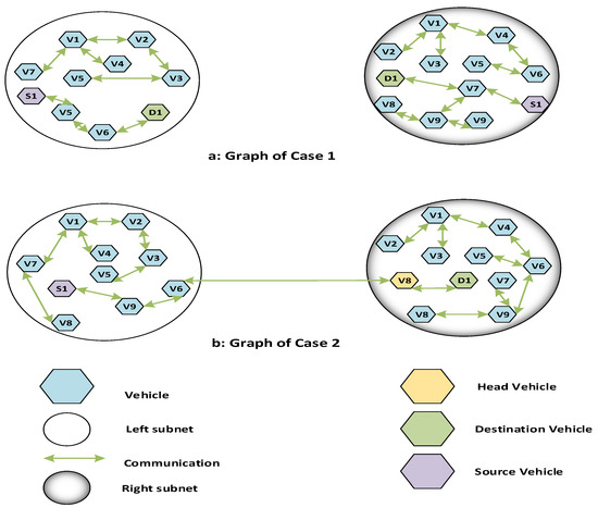 Figure 4 shows how graph-based topology improves the speed efficiency of vehicles between source and destination junctions, allowing each vehicle to reach its destination without wasting time, delays, or fuel. This model shows the two scenarios of V2V communication (scenario ‘a’ and scenario ‘b’). In first scenario both source and destination in a single subnet. They can communicate easily without involving any head node. However, in the other scenario of the unicast module, both source and destination vehicles at the different subnet via a head node. We will show you how to choose a head vehicle. In scenario two, the head node creates several zones to pick a peripheral and found target vehicle. VDM-SL may also be used to turn a graph-based model into a formal model.